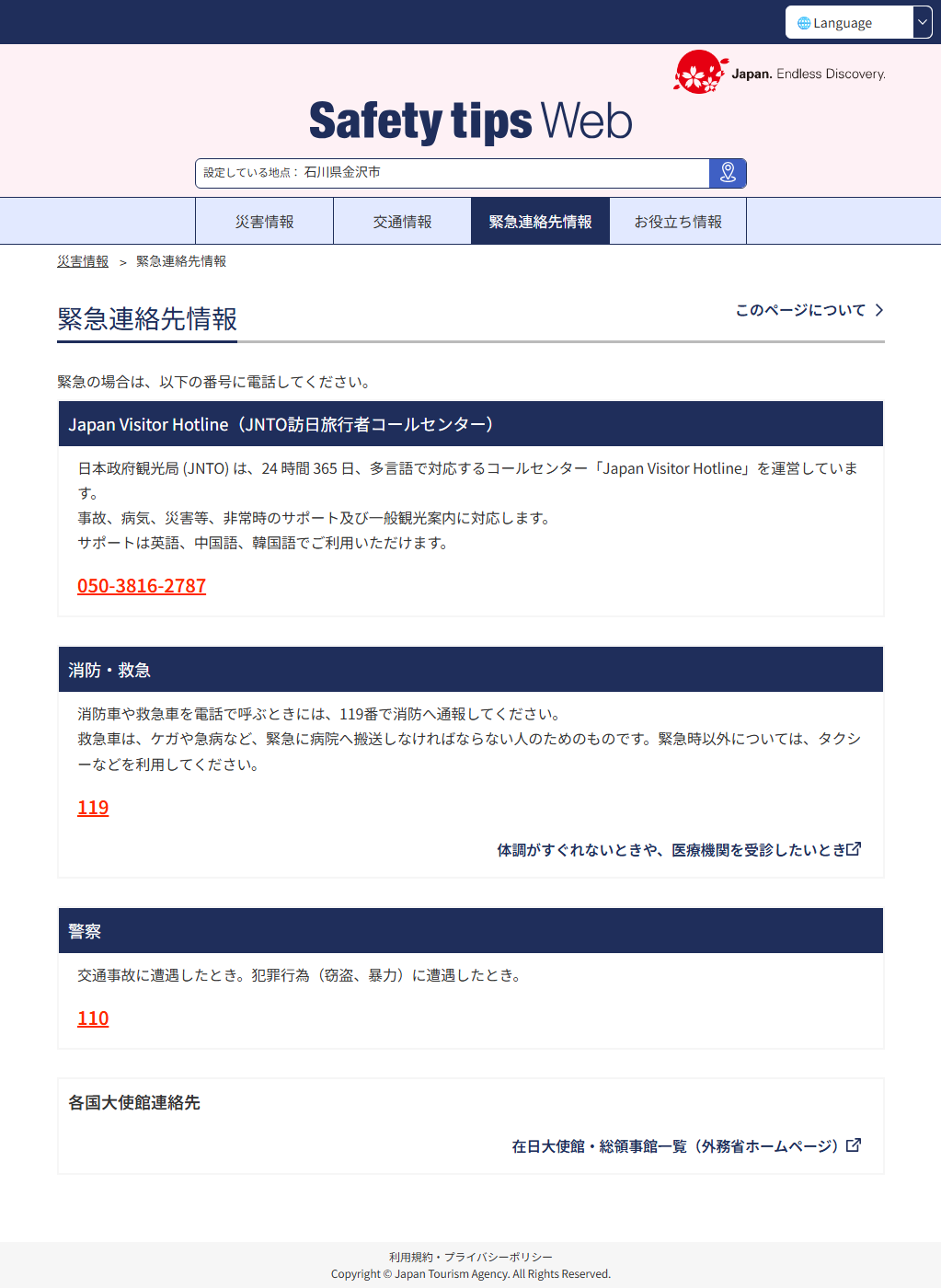 訪日旅行者向けコールセンター、消防救急、警察の連絡先を確認できます。