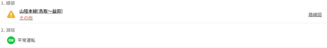 「情報を取得」ボタンを押すと設定地点周辺の駅の鉄道運行情報が表示されます。