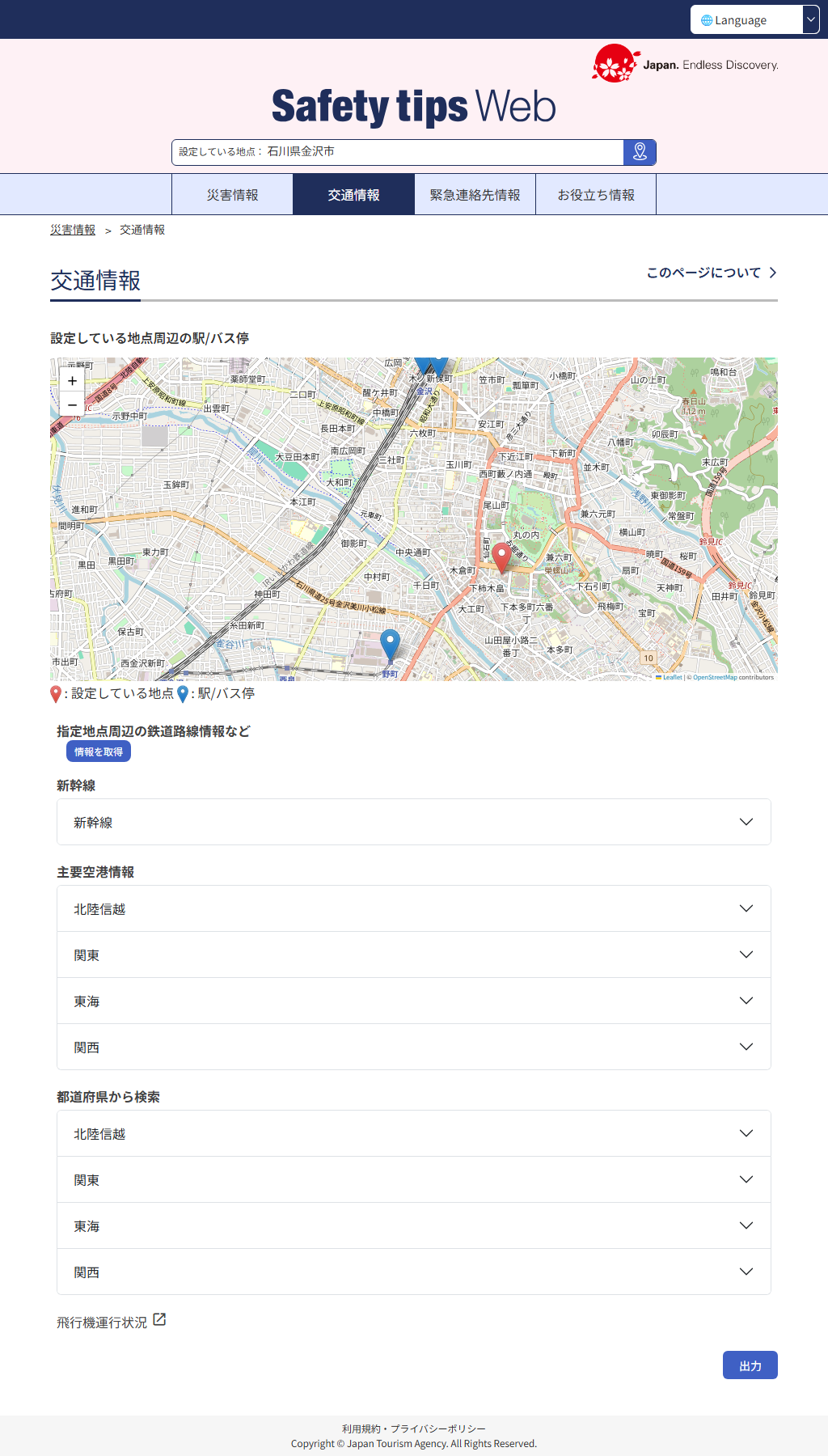 このサイトは、日本を訪れる外国人旅行者と観光事業者が、災害や交通に関する情報を分かりやすく確認、共有できるように作られたWebサイトです。