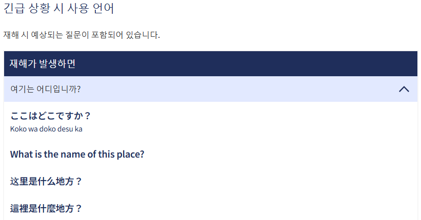 재해 시 주위 사람들과 소통하는 데 도움이 되는 문구를 4개 언어로 확인할 수 있습니다.