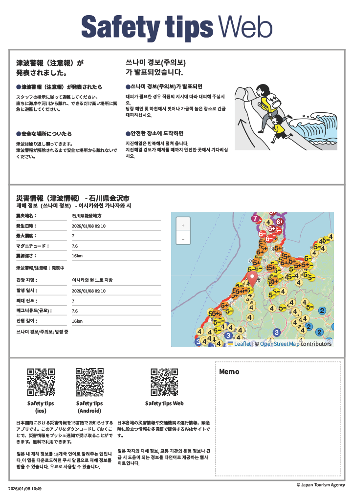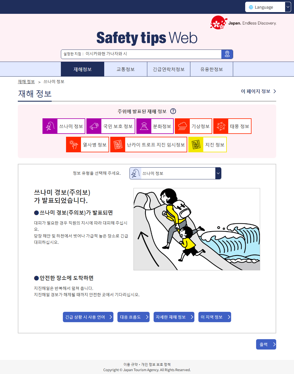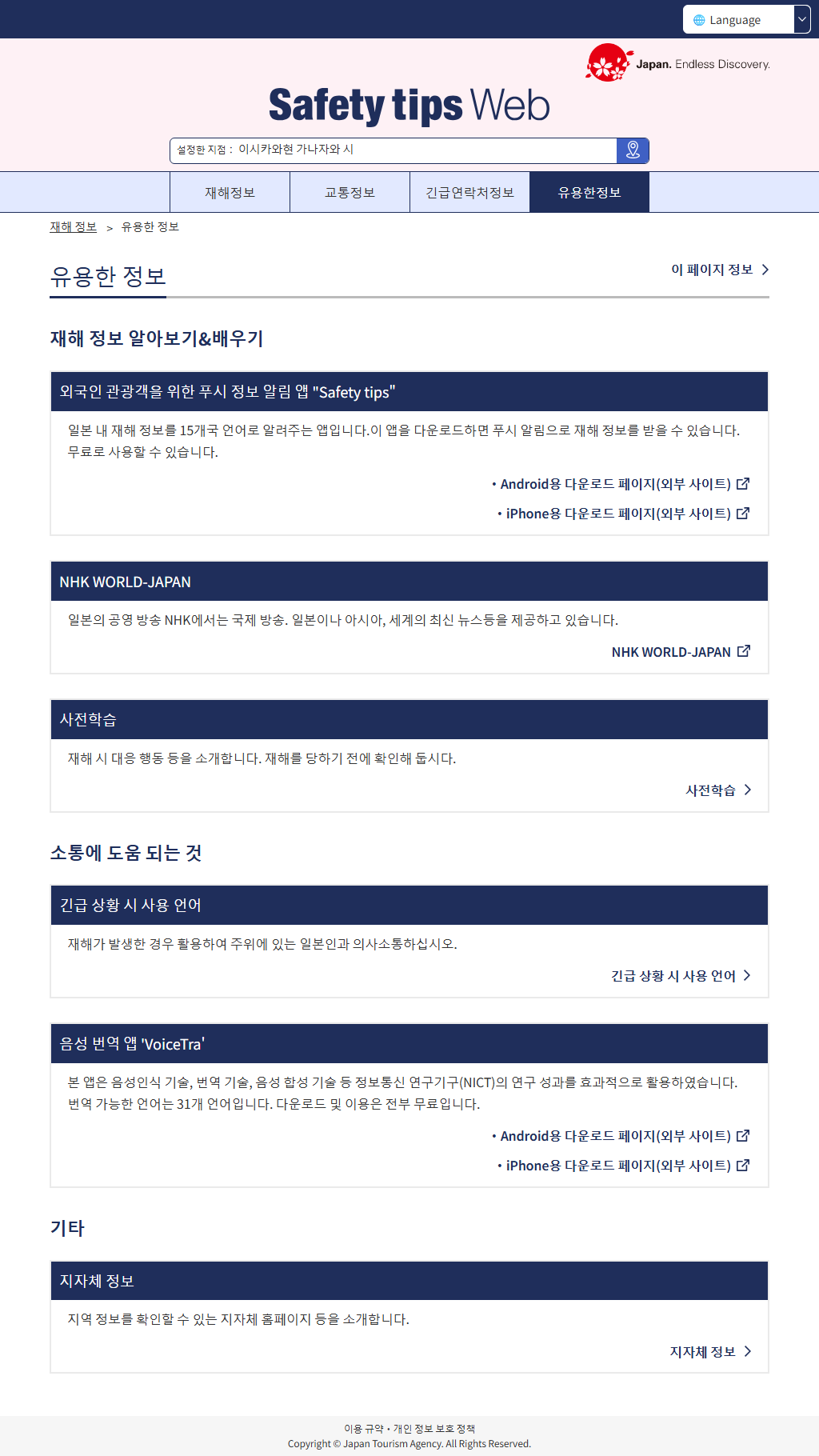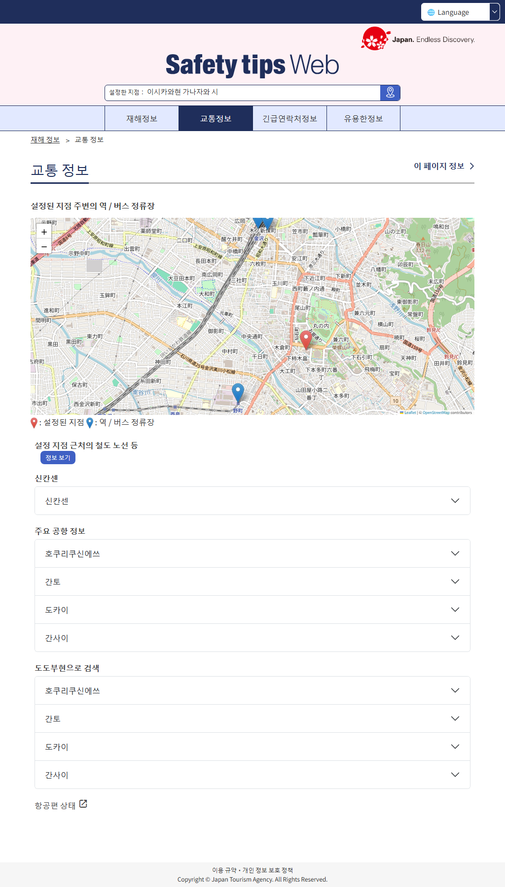 이 사이트는 일본을 방문하는 외국인 여행자와 관광 사업자가 재해나 교통에 관한 정보를 알기 쉽게 확인하고 공유할 수 있도록 만들어진 웹사이트입니다.