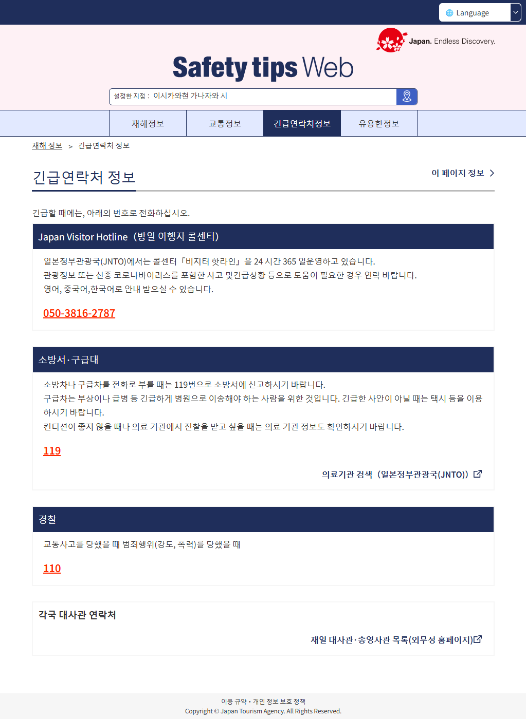 방일 여행자를 위한 콜센터, 소방서 및 구급대, 경찰 연락처를 확인할 수 있습니다.