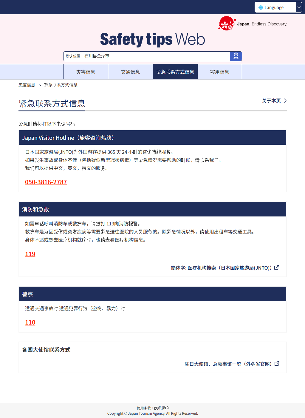 可以查看访日游客呼叫中心、消防急救、警察的联系方式。