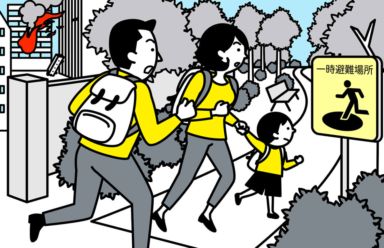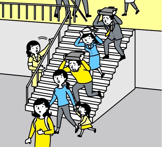 鞄などで頭を保護し、落下物に注意してできるだけ構造物から離れます。