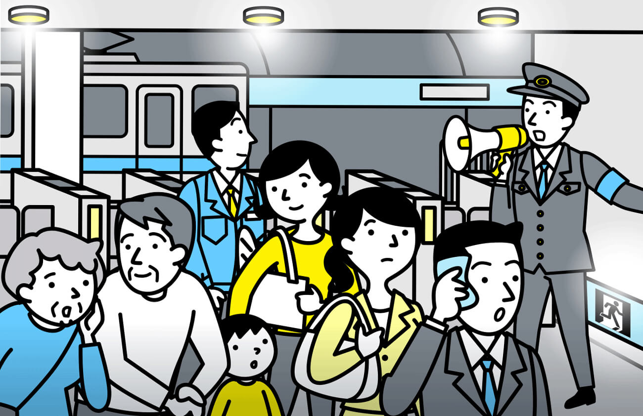 電車や地下鉄の場合、勝手に線路に下りると大変危険です。落ち着いて行動しましょう。