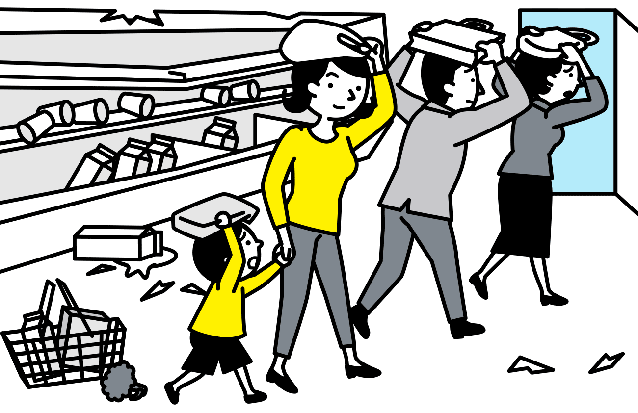 頭を保護し、移動・落下物の少ないホールや柱付近に身を寄せます。