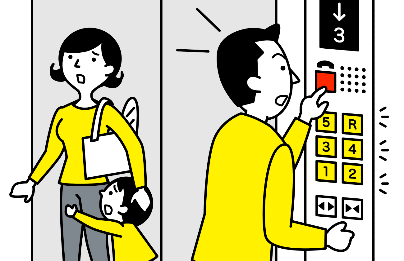 閉じ込められたら、「非常用呼び出しボタン」で外部と連絡を取ります。救助後は、係員の指示に従います。
