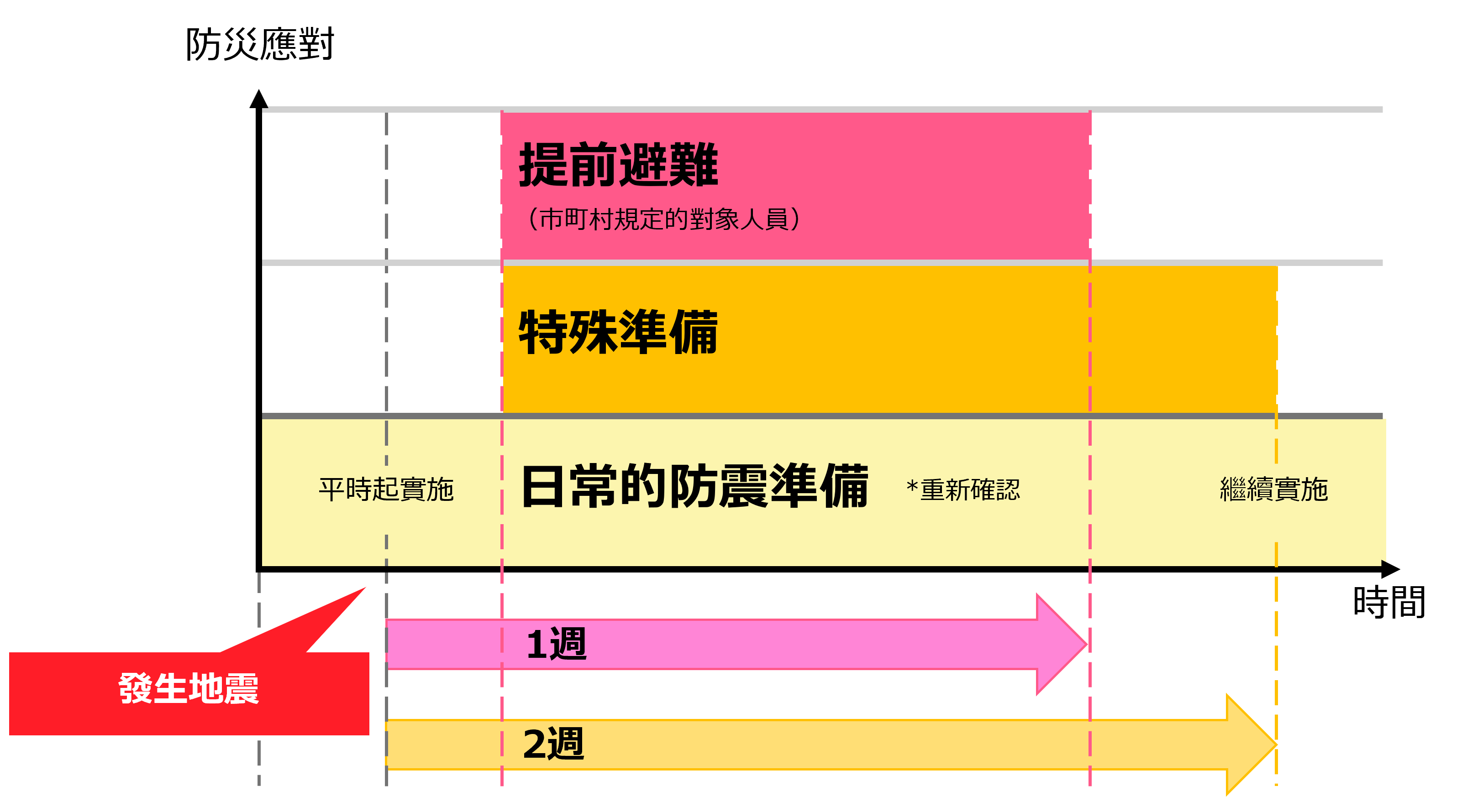 非對象人員則繼續日常生活,同時做好「特殊準備」和「重新確認日常的防震準備」。