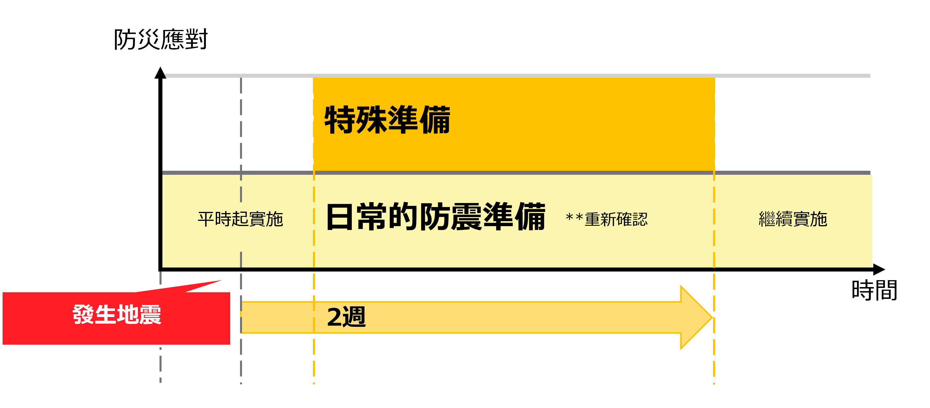 繼續日常生活,並做好「特殊準備」和「重新確認日常的防震準備」。