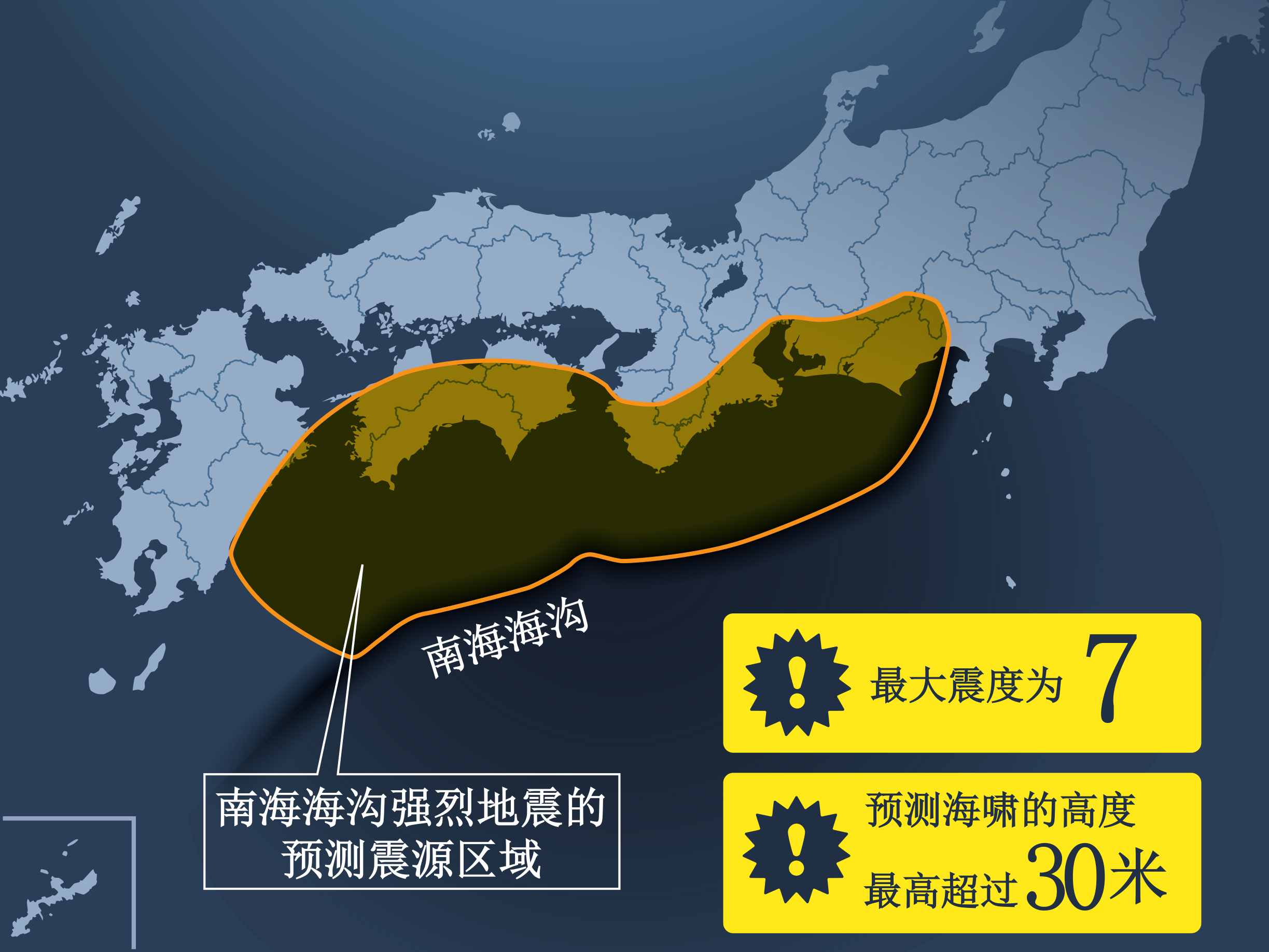 震源区域为位于静冈县至宫崎县的太平洋沿岸的板块边界(南海海槽)的大规模地震。在过去,每隔100至150年会反复发生。