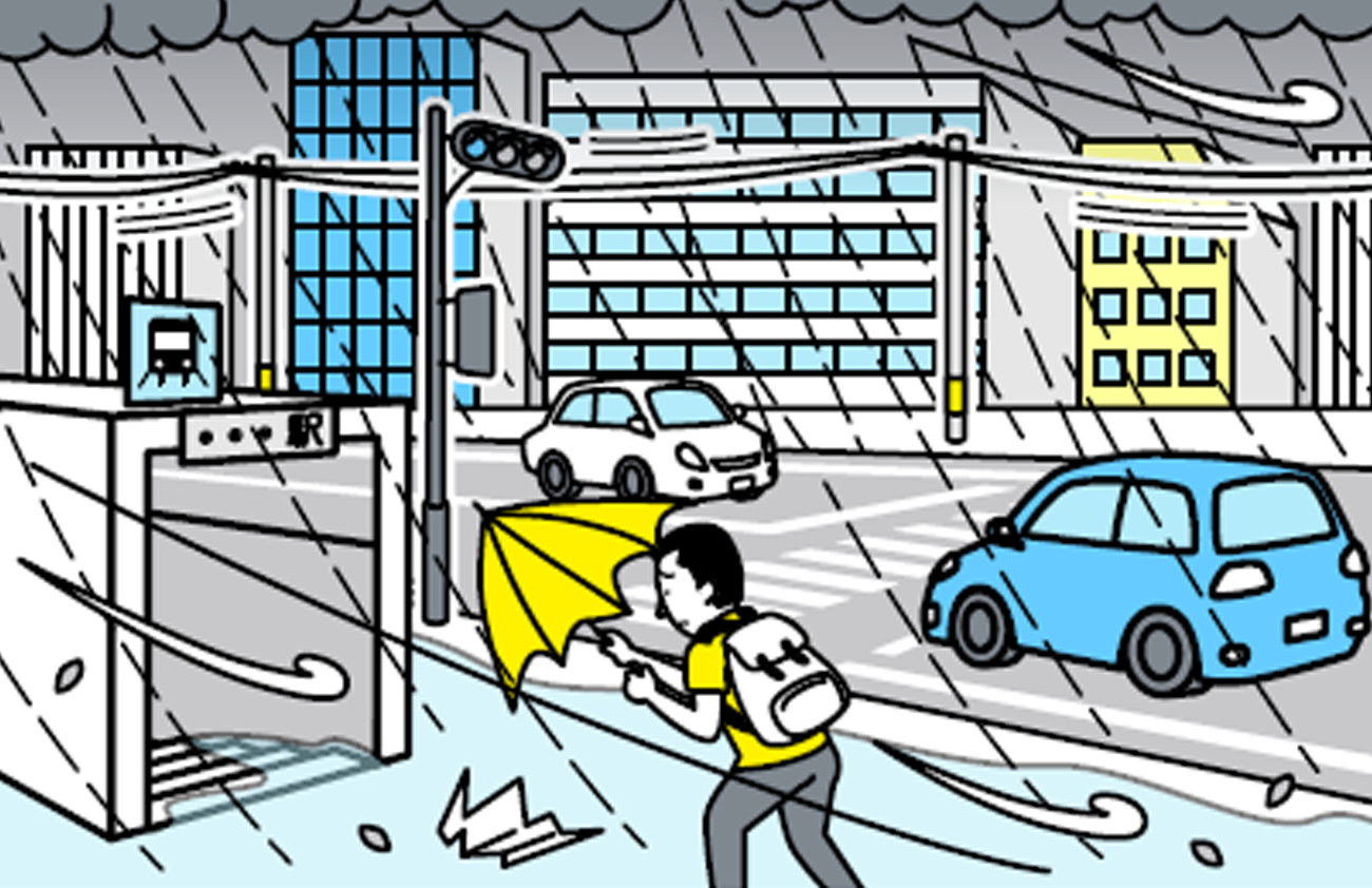 台風が接近すると、急に雨と風が強まります。強風の中での外出は危険です。