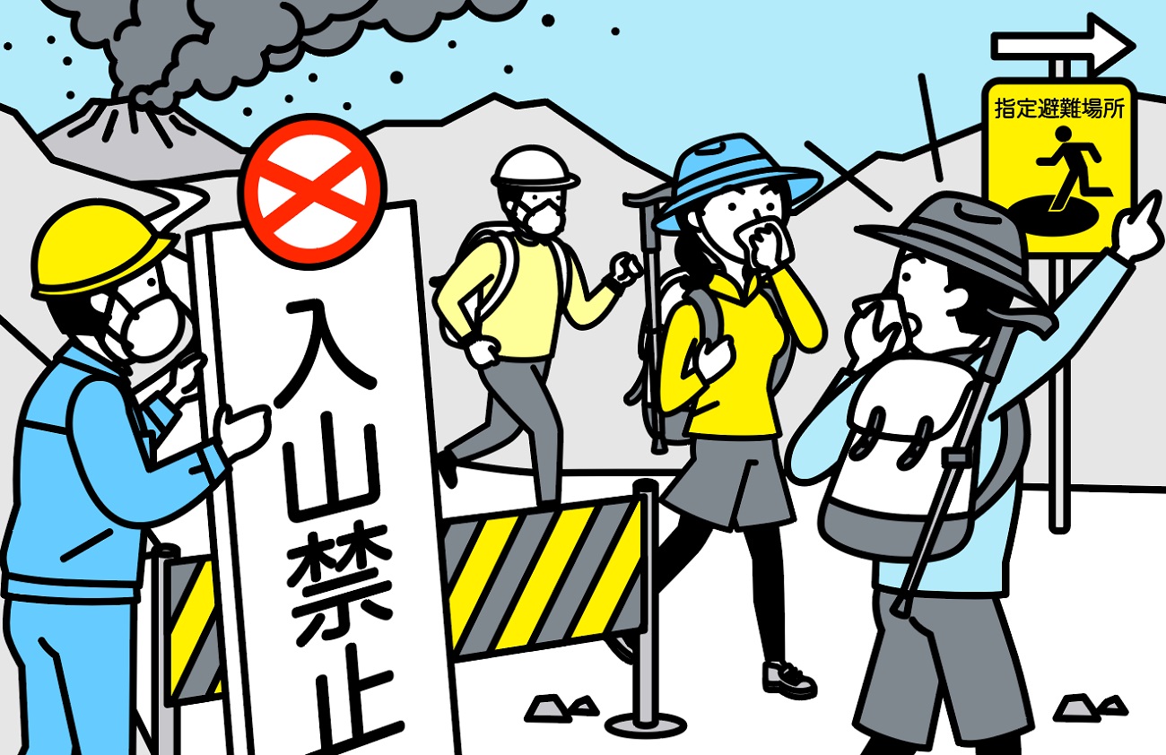 気象庁が噴火警報を発表すると、入山規制、避難指示、退避勧告がだされるので指示に従います。