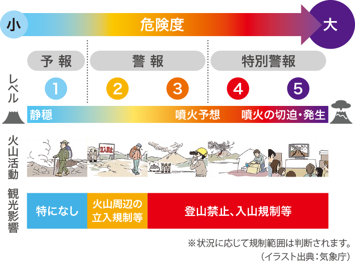 噴火警報の中で発表される噴火警戒レベルに応じた行動をとりましょう。