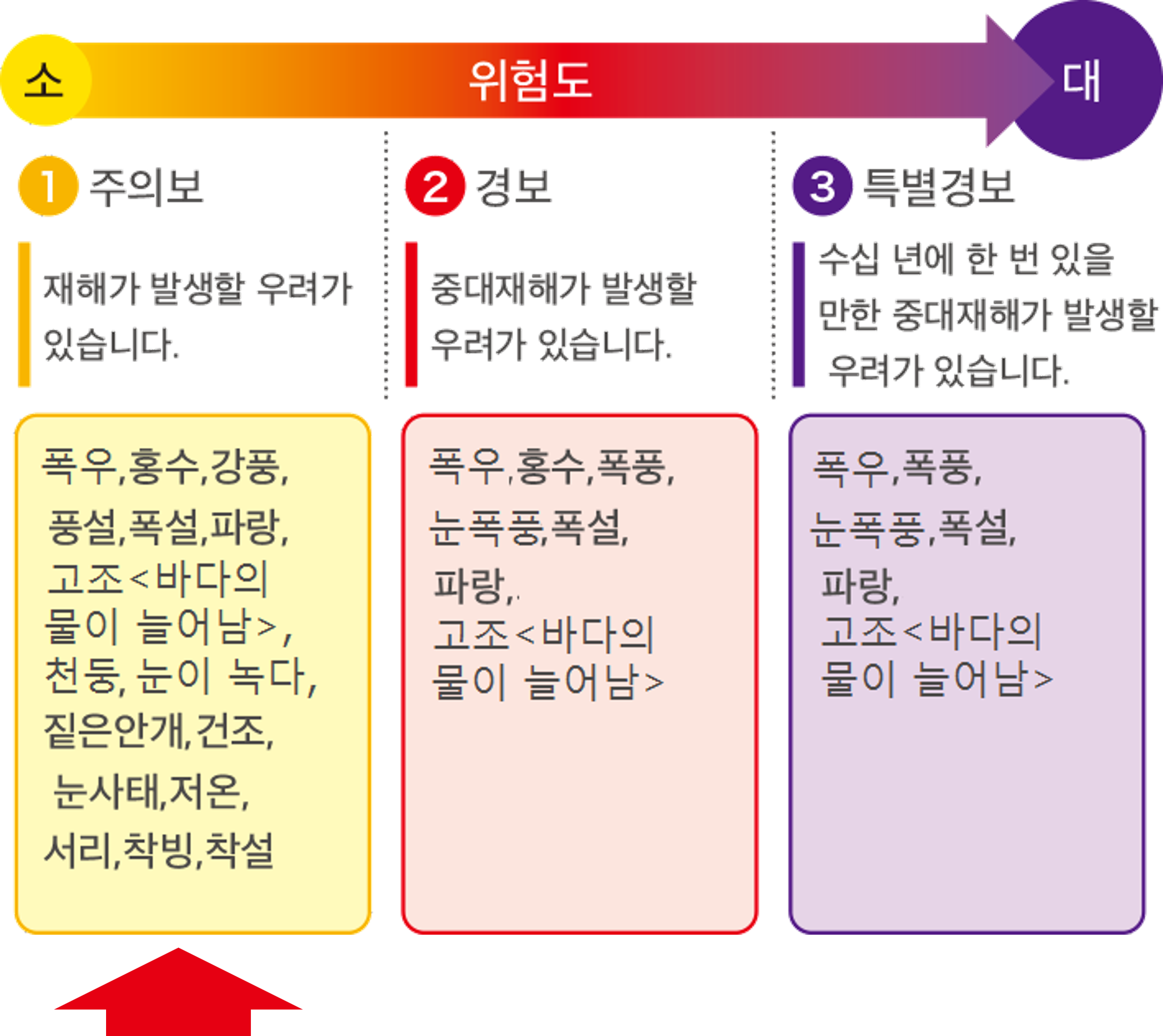 호우와 강풍 등으로 인해 재해가 일어날 우려가 있을 때 기상청으로부터 주의를 권고합니다.