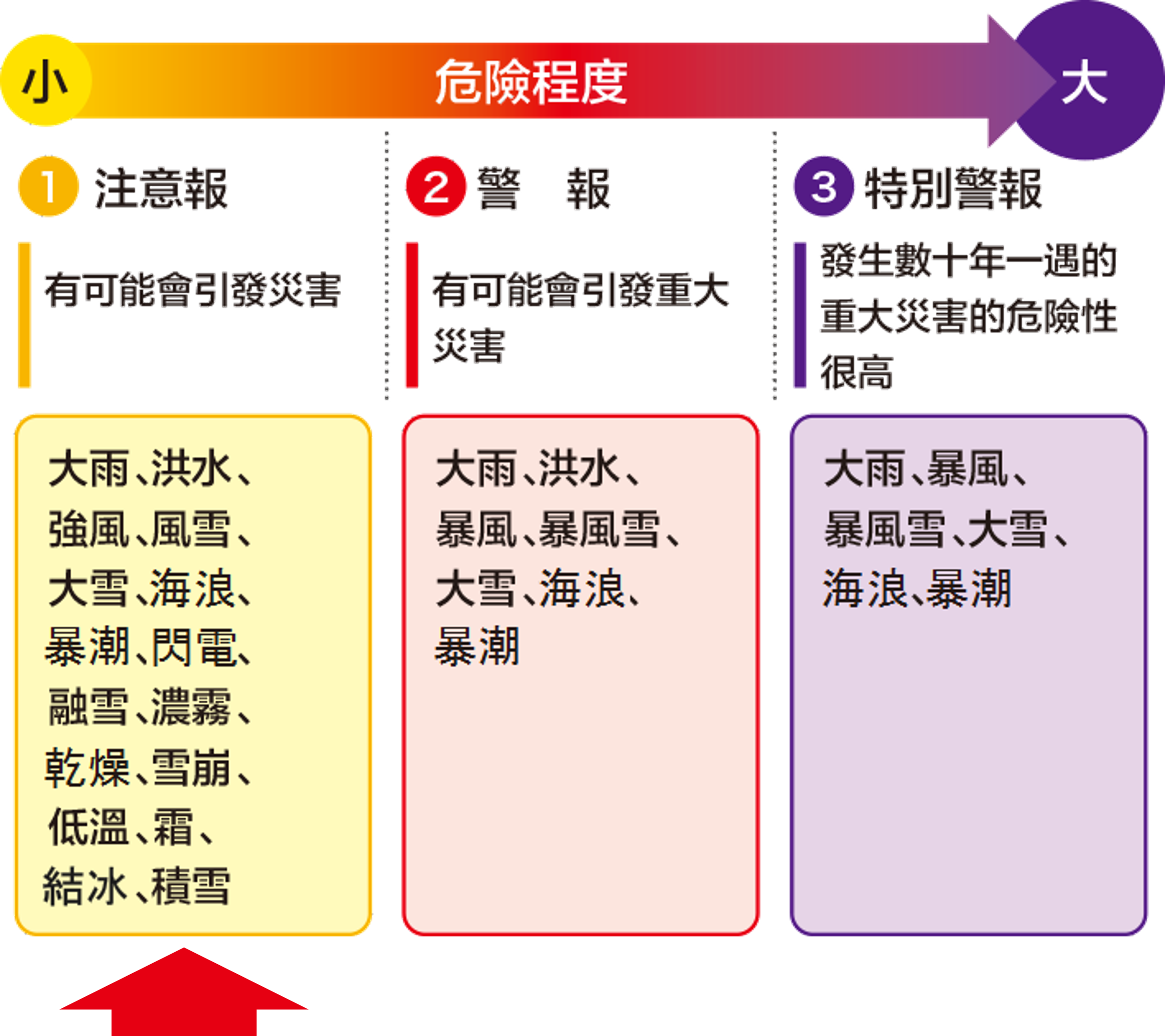 當大雨或者強風等可能引發災害時,氣象廳會提醒民眾注意。