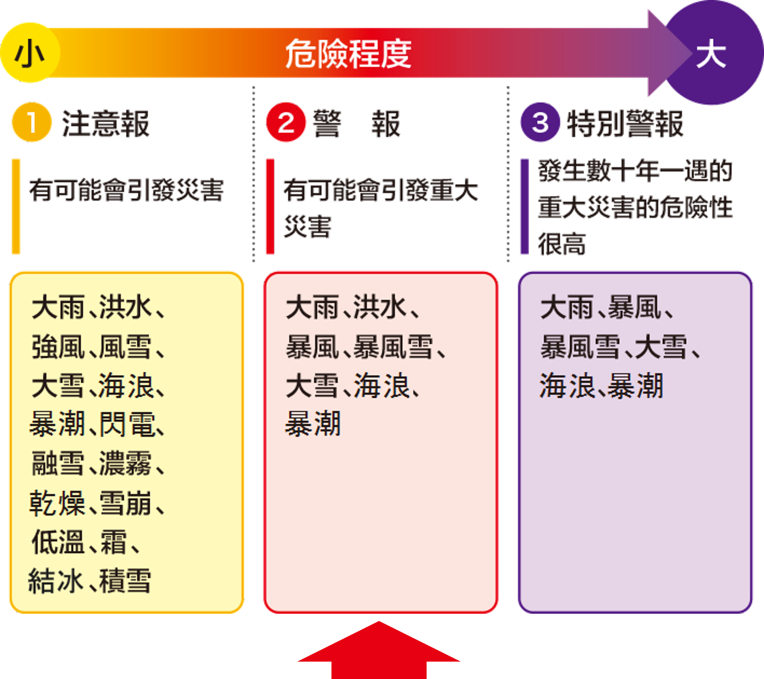 可能發生重大災害時發布,呼籲相應地區進行警戒。